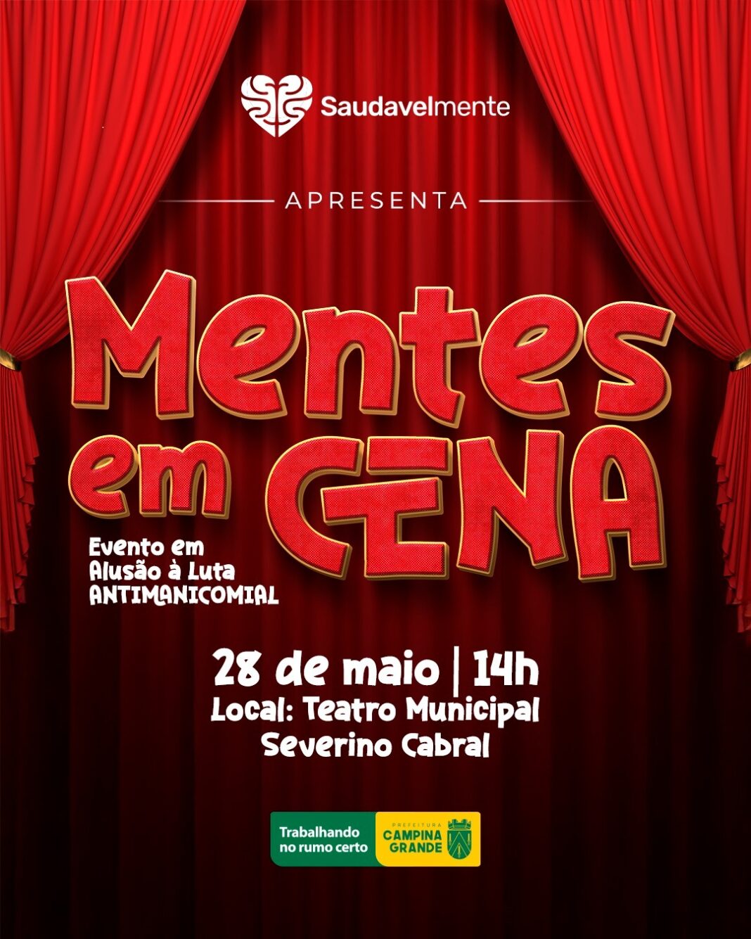 Acontece nesta quarta (28), o primeiro (Mentes em Cena), um espetáculo desenvolvido pelos pacientes e profissionais da rede de Saúde Mental, através do programa Saudavelmente. A apresentação será realizada no Teatro Municipal Severino Cabral, a partir das 14h.