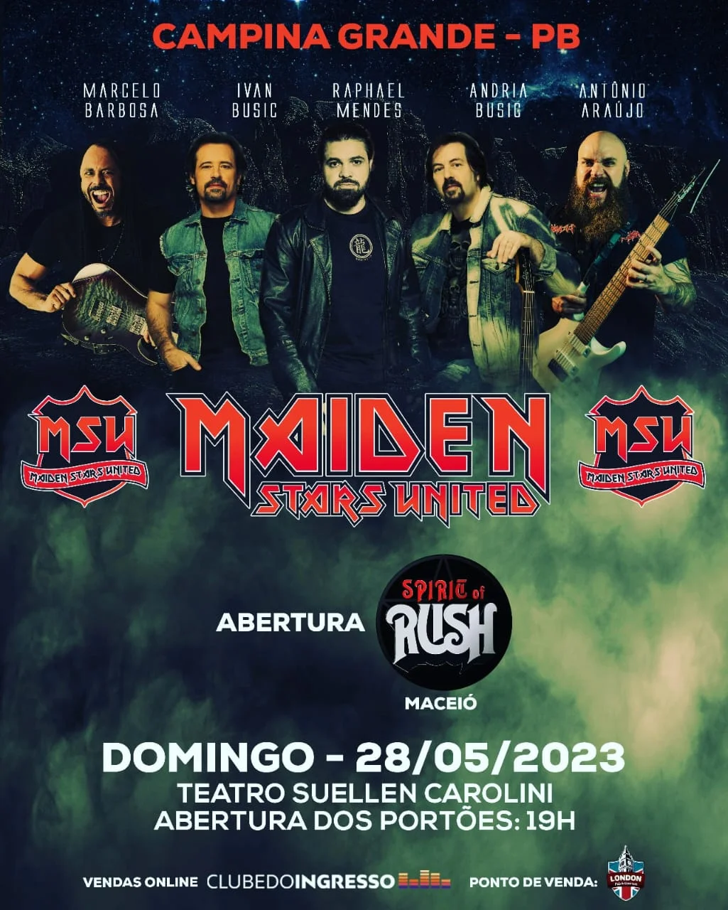 Maiden Stars United pode parecer um nome até pretensioso. Porém, a união de Raphael Mendes (vocal, Icon Of Sin), Marcelo Barbosa (guitarra, Angra) e Antonio Araújo (guitarra, Korzus e Matanza Ritual), Andria Busic (baixo e vocal, Dr. Sin) e Ivan Busic (bateria, Dr. Sin) fala por si. O supergrupo, criado para prestar tributo ao Iron Maiden e que tocará os grandes clássicos, fará a sua estreia nos palcos em Recife (PE) nesta sexta (26). Já no domingo (28) será a vez de Campina Grande receber o show no Teatro Suellen Carolini, a partir das 19h.